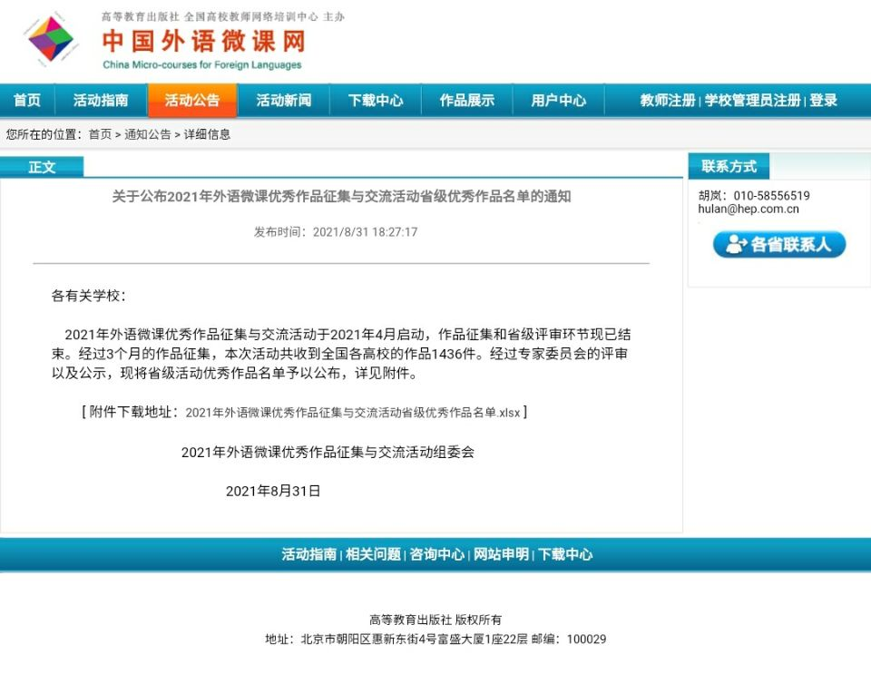 近日,从中国外语微课网传来好消息:我部教师黄竞玲、张岚经过激烈角逐,从众多参赛高校中脱颖而出,分别获得“2021年外语微课优秀作品征集与交流活动”省级一等奖、二等奖。