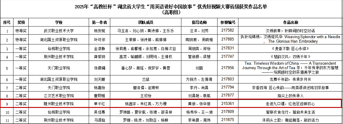 近日,2025年“高教社杯”全国大学生“用外语讲好中国故事”优秀短视频大赛结果出炉,由24级建筑工程技术专业学生杨鑫宇,单千红,朱红亮,万力墁赴随州市曾都区洛阳镇红色革命基地—九口堰现场拍摄、取景、制作、并全英文配音完成的外语短视频作品《走进九口堰,红色足迹印初心》,荣获湖北省二等奖。