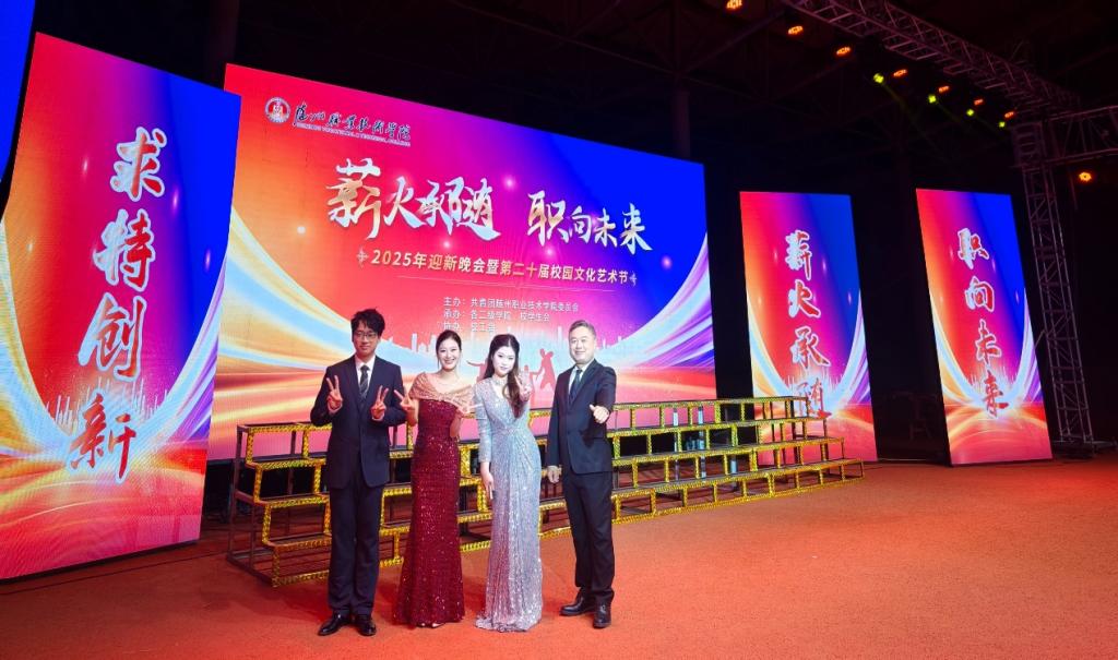 金秋送爽,丹桂飘香。202年10月14日晚,我校以“薪火承随,职向未来”为主题的大型迎新晚会在校田径场华彩上演,为全体2025级新同学献上了一场精彩纷呈的视听盛宴。在这场备受瞩目的盛会中,我校美育教研室的刘文娟老师以其专业的素养与独特的魅力,担纲晚会主持,成为晚会现场一道亮丽的风景线,充分展现了美育教师的综合素养与育人风采。