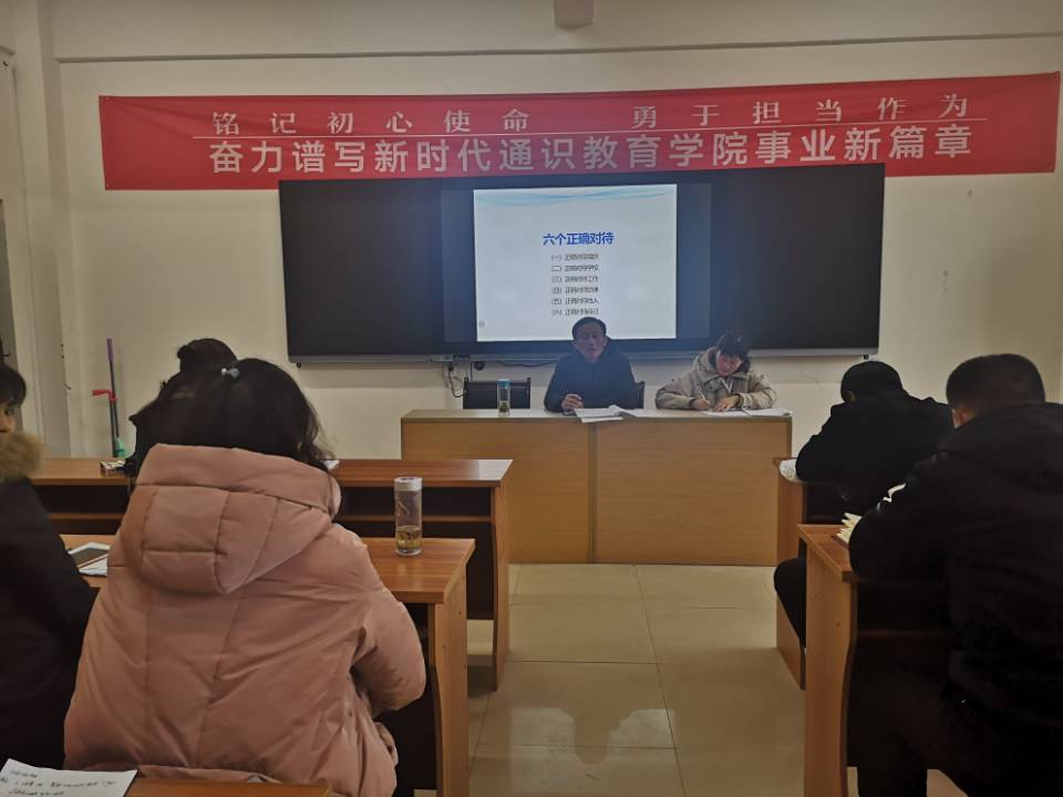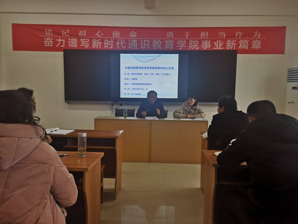 按照“不忘初心、牢记使命”主题教育、党委民主生活会和党风廉政建设相关要求,2019年12月25日,通识教育学院党委副书记肖新俊对通识教育学院党员和教师集体谈心谈话。谈话由通识教育学院办公室主任徐明主持。肖新俊以“如何对待组织、学校、工作、纪律、个人和他人”为主题,推心置腹、语重心长地和大家交心谈心。