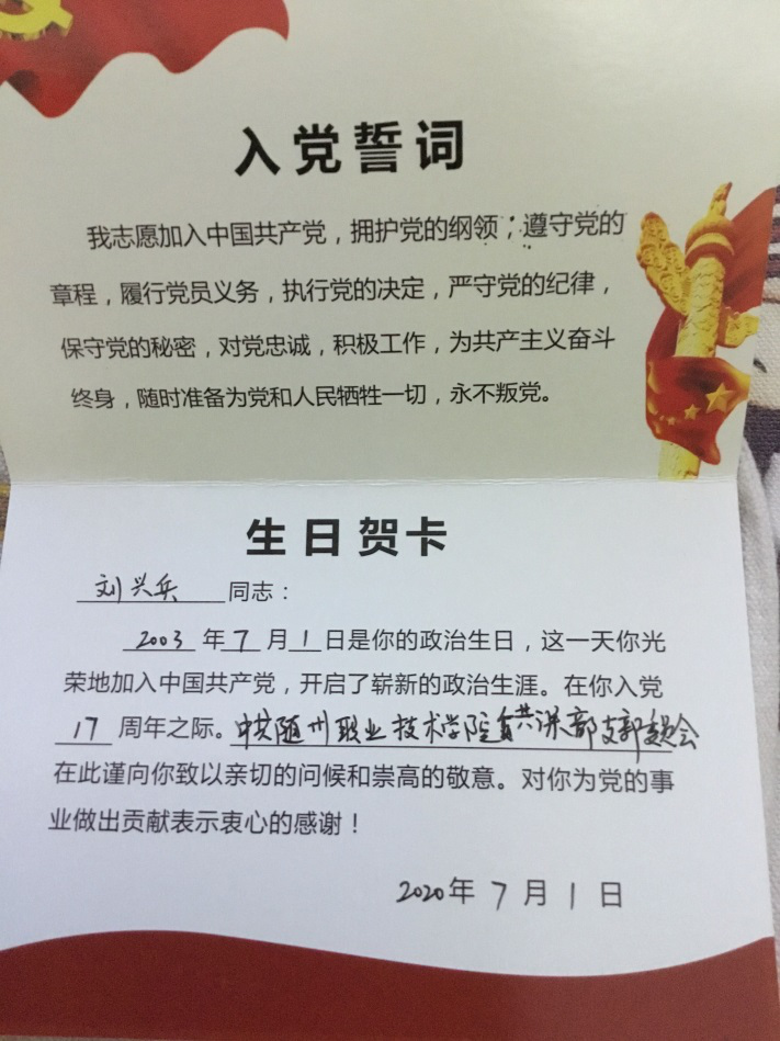 7月1日是一个特殊的日子,这一天是我们党成立的日子,支部书记张华丽带领全体党员庆祝中国共产党成立99周年并重温入党誓词。给六月份过“政治生日”的三名党员方立文、林邦钧、刘兴兵发生日贺卡,三位党员教师发表政治生日感言,三位同志都表达了对组织的关心对党在新中国成立以来取得的巨大成就表示无比骄傲和自豪。