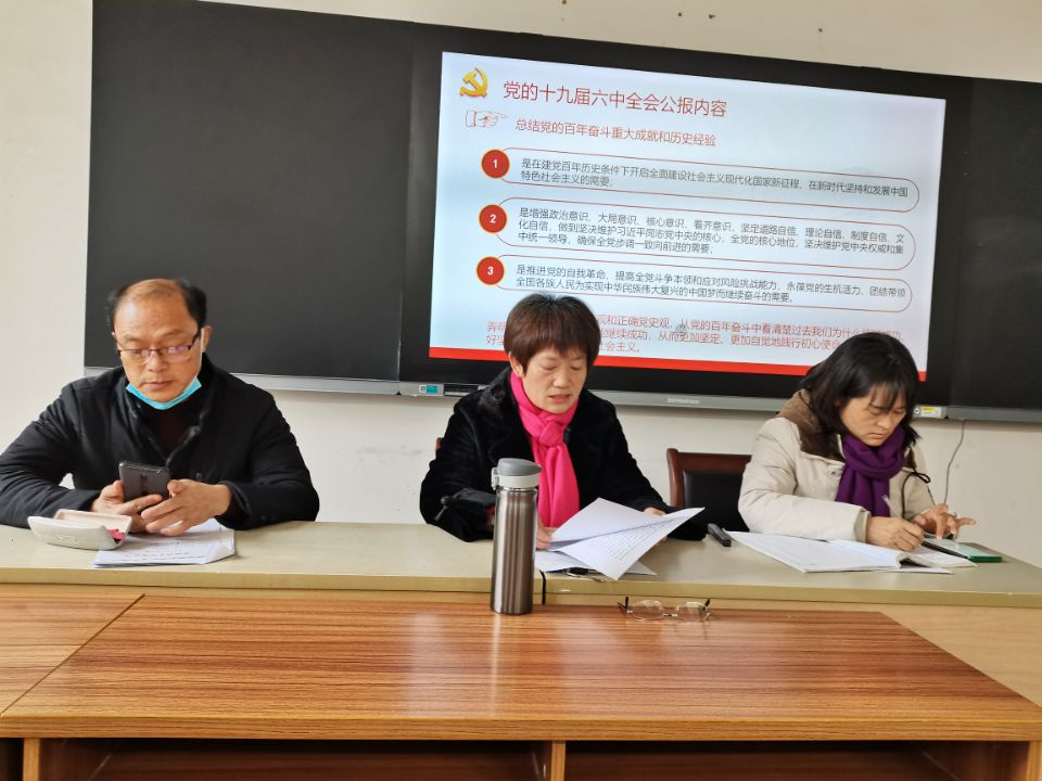 支部书记张华丽于2022年元月5日,在公共课部全体教职工大会上宣讲十九届六中全会精神,对《十九届六中全会》精神进行解读,谈体会和认识。全体党员在2月支部主题党日活动上参加十九届六中全会知识问答。