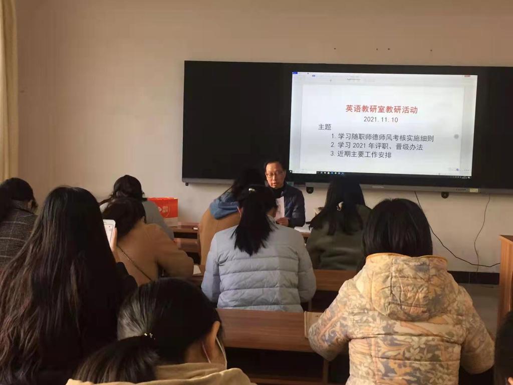 11月10日,英语教研室利用教研活动,组织教师认真学习《随州职业技术学院师德师风考核实施细则》。